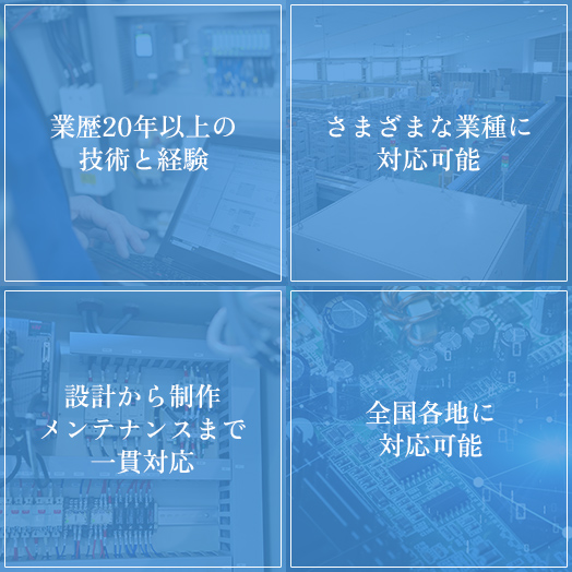 PLC・HMIソフトの開発、制御盤の製作、電気工事や改造まで。生産設備や産業機器の制御に必要な仕組みの整備を、ワンストップで承っております。